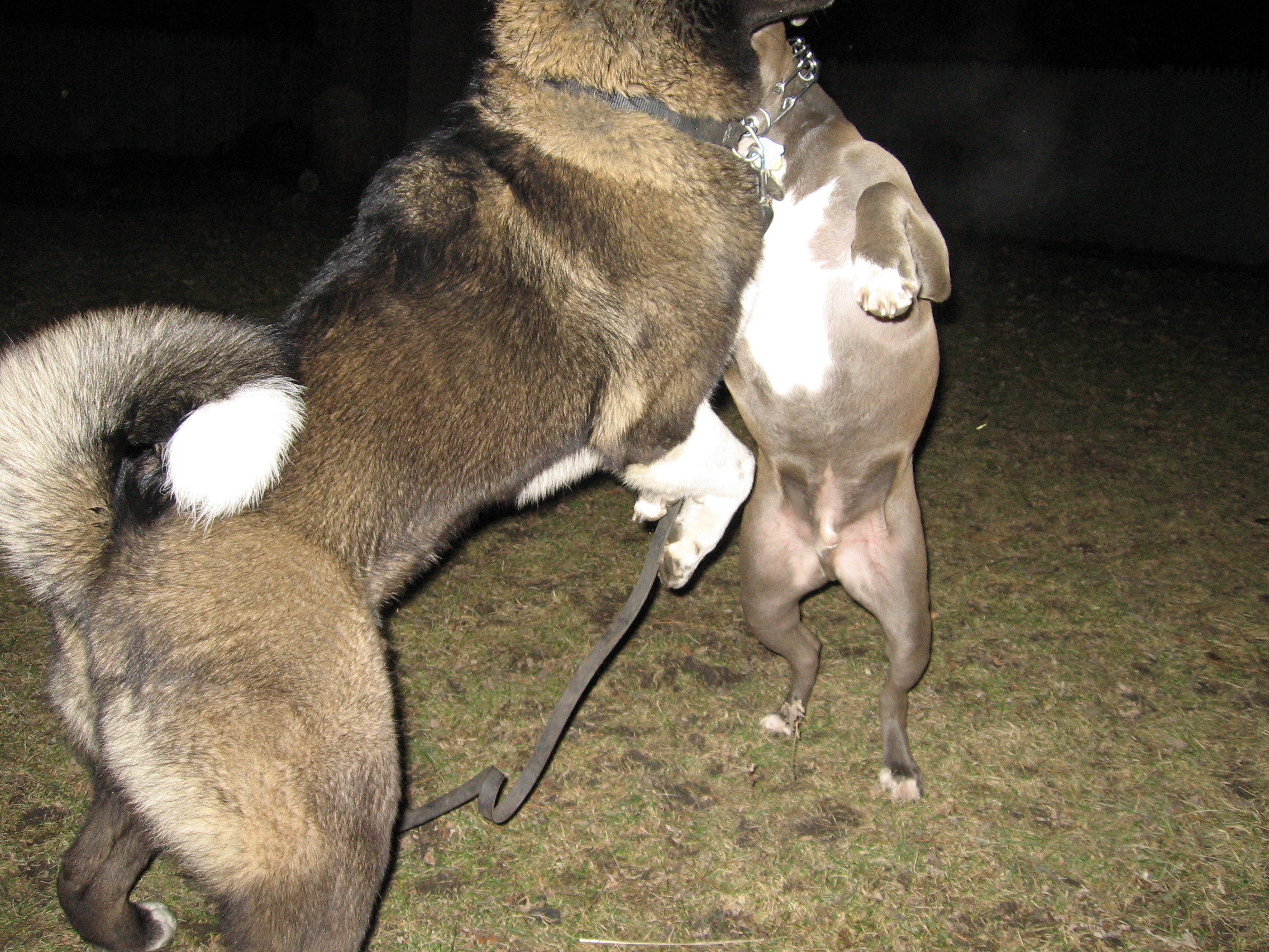 I just wanted to add that even though both breeds are very dominant and usually are bad with other dogs, they love each other and play wrestle for hours...They behaved very nicely with each other. Who would've thought too! A pitbull and akita!! Two dangerous breeds