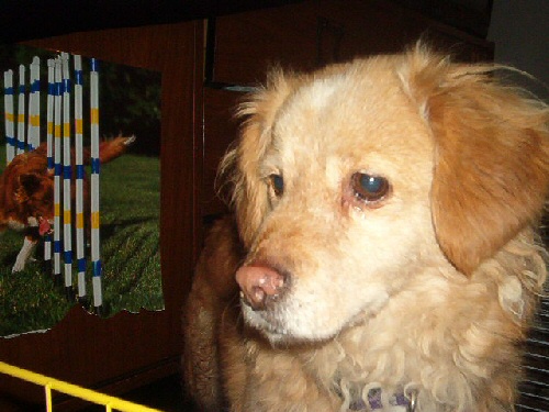 she is very well behaved, but my goodness is she ever badly bred, he whole structure is just totally screwed up, her teeth are all over the place her legs are splayed everywhere... poor thing. I got her all cleaned up, removed all the mats, clipped her nails(they were like 2 inches long!) gave her bath.. someone suggested she was a Toller mix as she she has a white chest, white feet and a white circle on top of her head lol