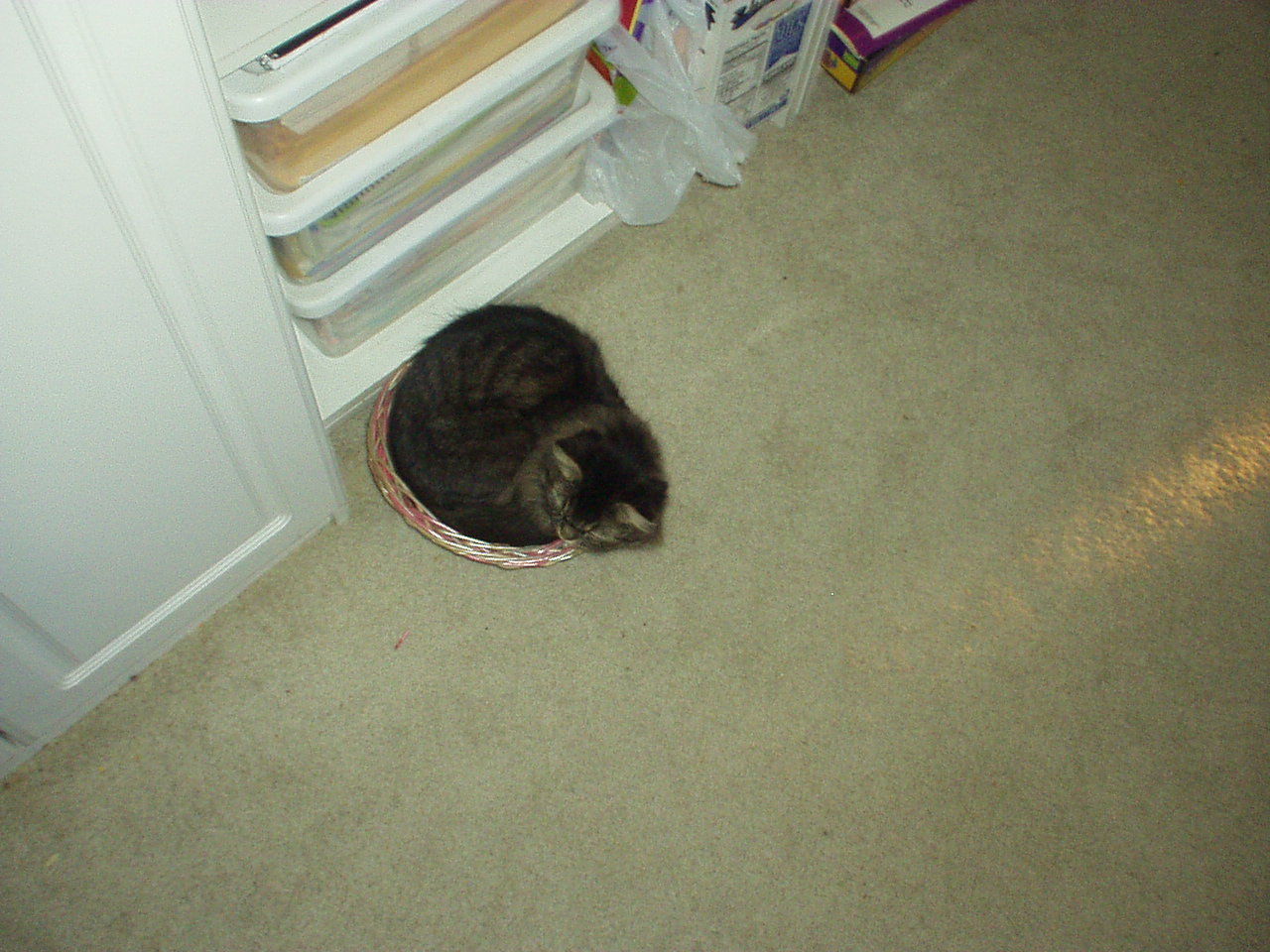 LOL She barely fits in that basket. I'll never understand why cats love to try to fit into the smallest boxes or baskets.