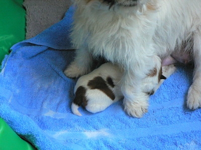 The babies eyes are starting to open all except my little white faced boy (Trust me to fall for the 'slow' puppy lol) and they are starting to try and get up on all 4 instead of crawling everywhere. Mum and i spent quite a bit of time with them this afternoon, cuddling and playing with ther Mama.