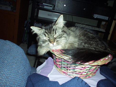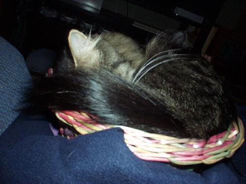 That's quite a tail; how fluffy! Aren't they a riot? My Pidge is my largest cat but she found a bowl that I kept in the center of the table in the patio room and that's where she decided she liked to curl up. Don't bother w/the nice bed I got for ya. That's no good!