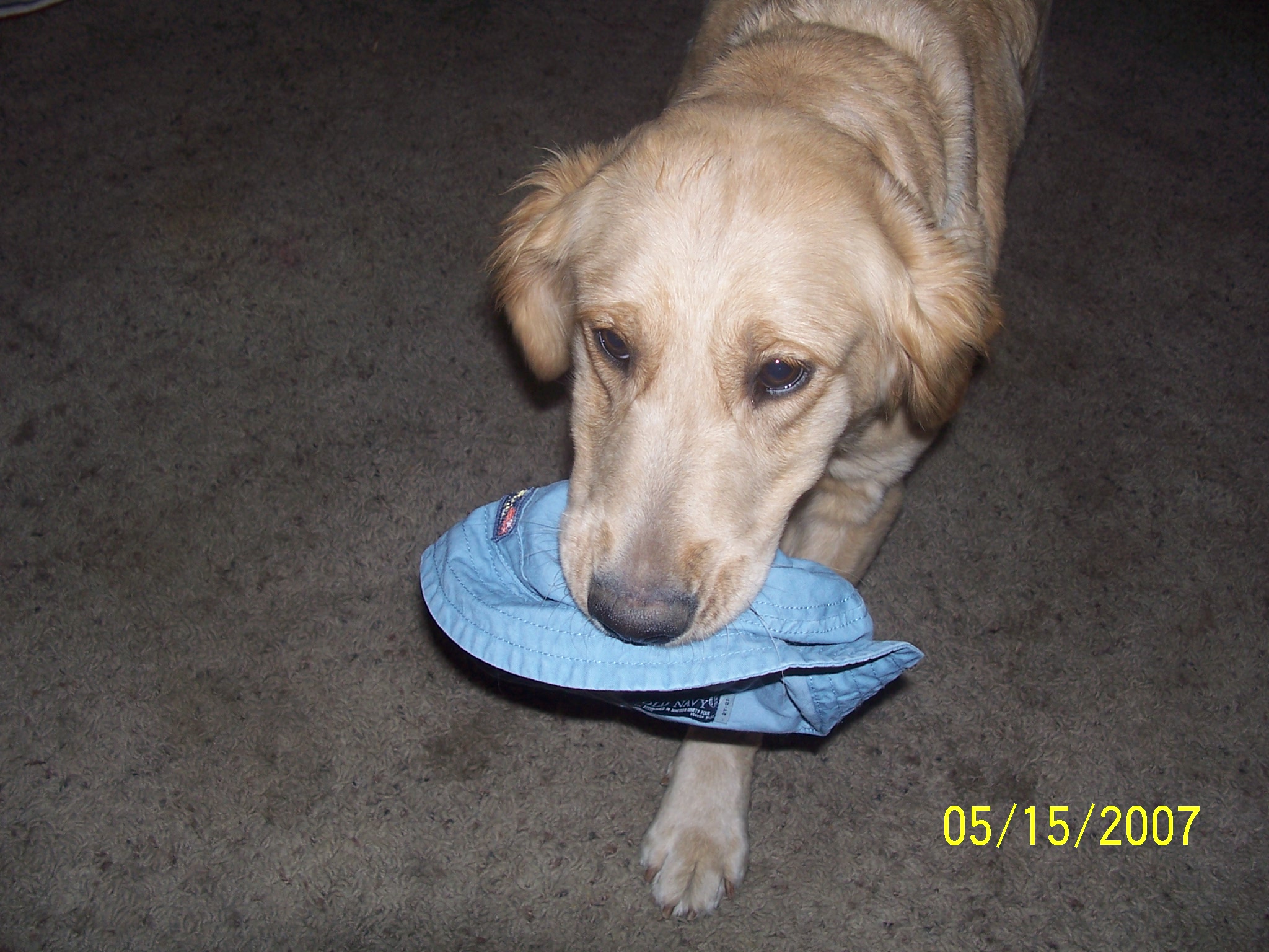 Here is a few pics of Gracie with some things in her mouth.... Her with Aidens shirt, hat, a shoe, and a stuffed toy.... she usaully helps herself to the laundry and Aiden's toy boxes![]()