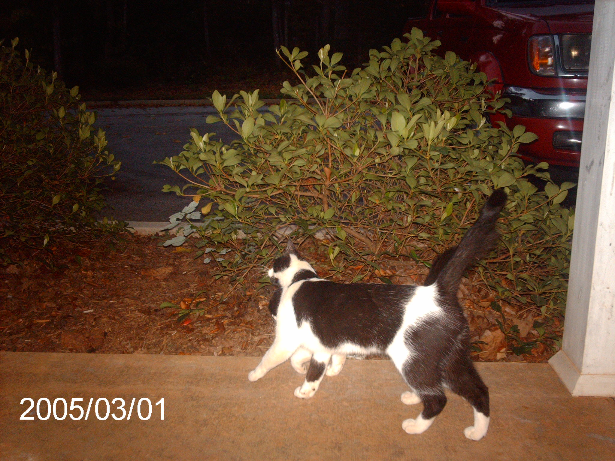 Well, i dunno what happened to the rest of them. When I arrived here, there was only three. Then two died, probably because of starvation. I say probably because they just disappeared one day. So, now we feed them our table scraps every night and if there is none then we feed them some or Reggies dog food. We are planning, the next time we go to Wal Mart, to buy an big bag of some cheap cat food to feed them. Hey, at least its better for them than humans and dog food! Also, i dunno why my camera does that. One probable reason is that my dad was spinning in circles on an swing and whacked the pocket in which i was carrying my camera. It busted the screen and also might have messed up the clockwork. It was fine before that though.
