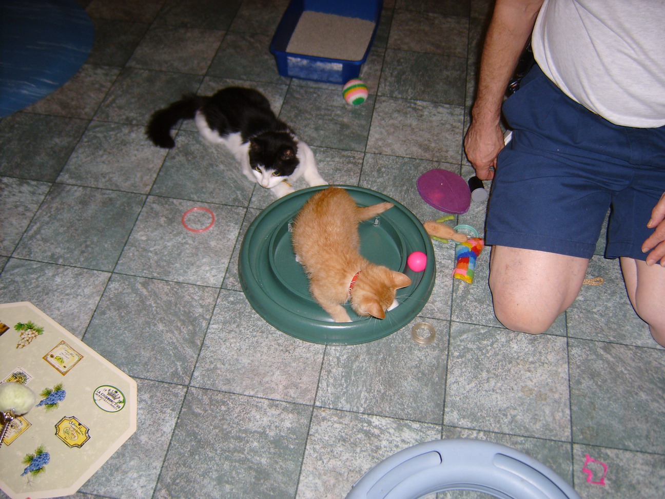 I am trying to remember the name of the Little Tuxedo whos checking out his New Pal!!!