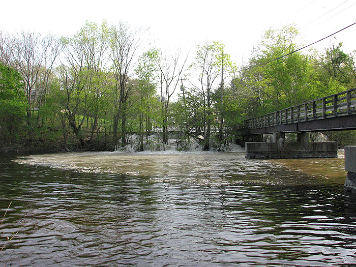 I watched two kayakers paddle down the river. (There is a popular canoe and kayak rental place just downstream.) I don't think they knew anything strange was happening! The man saw me on the opposite bank taking photos and pointed out the waterfall to his companion. What shocked me was what did not happen. They entered the stream of water in the middle of the river but they did not speed up to any noticeable degree. Eight million gallons per hour added to a small river is not much. The only real effect to the river was the movement of soil and sediment changing its color to brown.