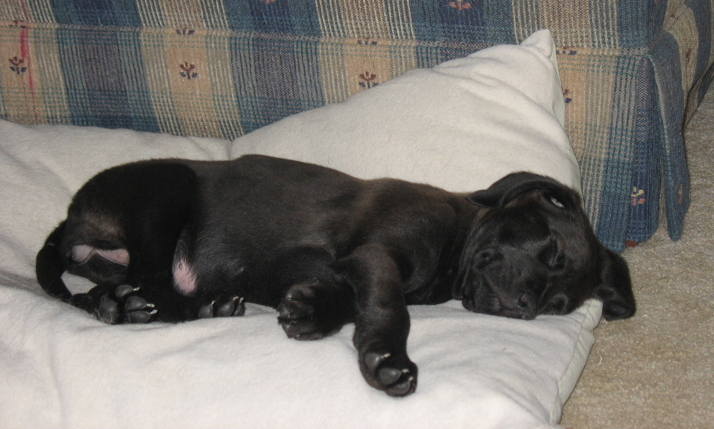 I got to meet the puppy today. My daughter brought her over for a visit. Cats have been really funny. The pup immediately wanted to play with Buddy, but Bud didn't reciprocate. He gave the pup a swat. The pup learned fast and is keeping her distance. Bud was hanging out under the end table in the living room while the pup played. Then the pup fell asleep on the cats' bed. All 3 of the cats have come in at various times and slowly walked up and sniffed the pup. She is really tired. Here are some pics.