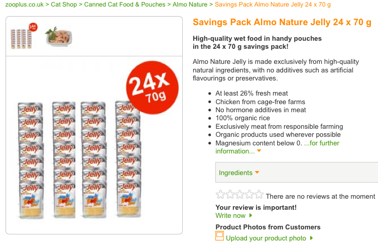 Now, I try to feed my cat a diet as high in meat as possible, with him being a carnivore, so I order a variety of the more than 75% meat, grain-free foods, such as Applaws, Almo Nature and Orijen, which are organic, too."