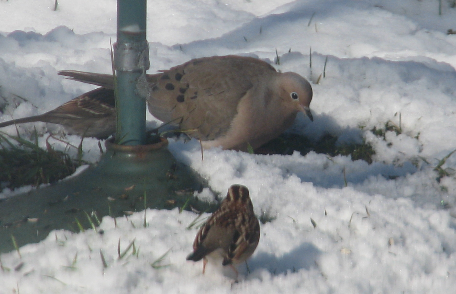 No snow here but a cold day, my feeders have also been quite busy. Pretty mourning dove with the sparrow!