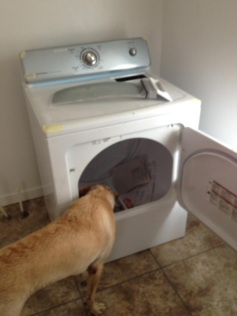 My son sent me pics and and a video to my camera today. Comet apparently has two very important jobs already. He is an inspector of new household appliances. See photo. In the video which I can't figure out how to get from my phone to the computer yet, he is growling and barking at the lawn mower (not on or running). So I guess he must be a supervisor of lawn equipment?