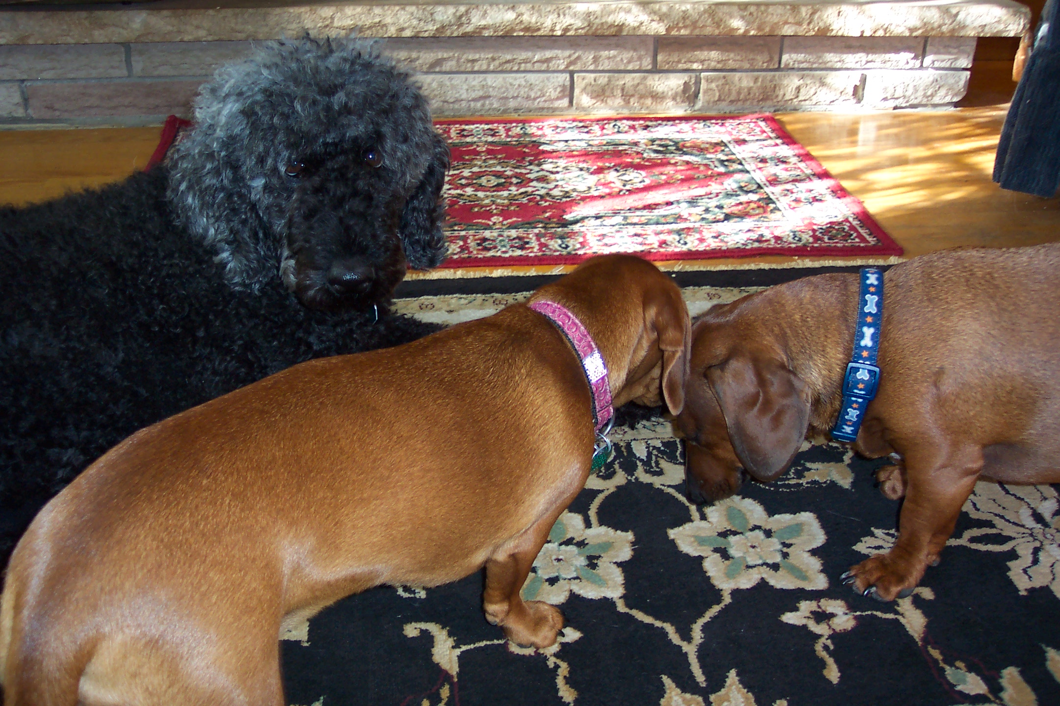 Oh My Goodness! What beautiful furbabies you have! I must say they look very cozy in front of the fireplace. A long time ago I had a doxie and she was very sweet; I'm sure your two are sweet too.