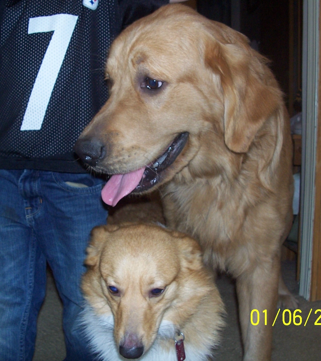 Here is a few pics of my sisters dogs... The smaller corgi mix is Toby and the golden retreiver is Samson(my dog Gracies son).. The pics are blurry and arent the best but oh well I tried