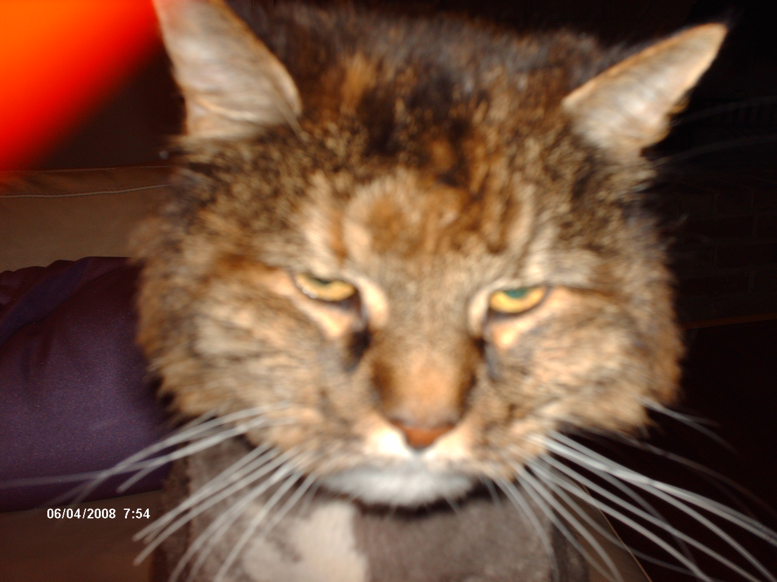 I took a few more pix, albeit they're not very good either. I have a really cheap, cheezy camera. If I can get a break w/vet and medical bills, I'll get a new one soon. Pidge, of course, kept moving, so this is the best I could do. In the first pic, her facial expression says it all: You're pushin' your luck, Mom. She's pretty cute for 18 1/2, yes?![]()