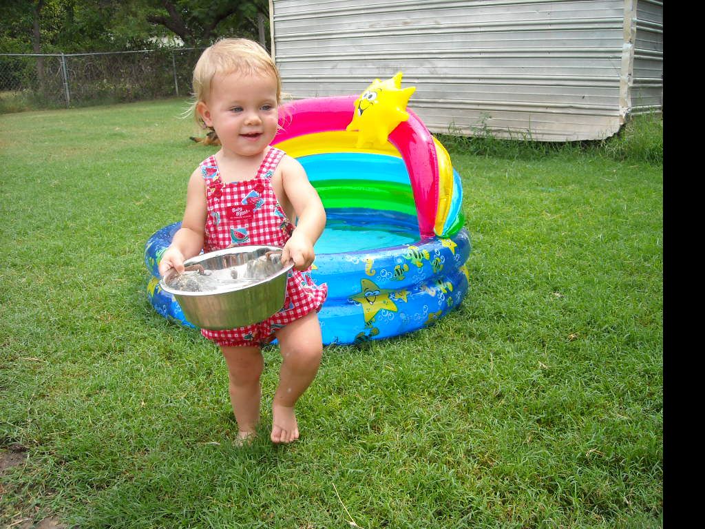 The first one is of Quinn carrying around the dogs bowl of water. She usually takes it up to one of her doggies and tries to pour it on her doggies but ends up pouring it on herself.