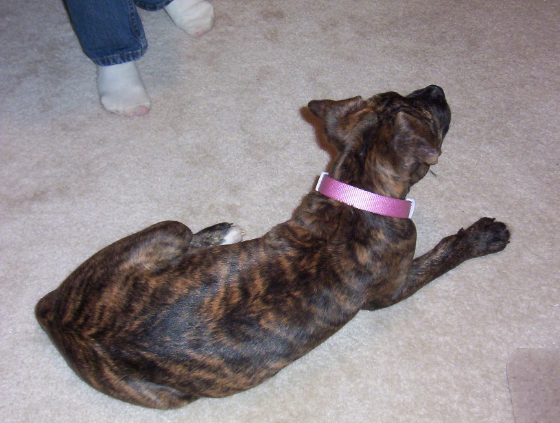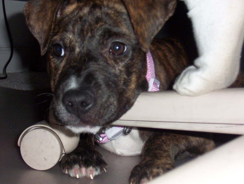 They said he was a 12 week old American Staffordshire/Shar-Pei mix, but my vet says he is definately not an Am. Staff. He believes he is a Bullmastiff mix because of his bone structure, etc. In addition, he believes he is more like 9 weeks old because his teeth aren't loose yet. He currently weighs around 19-20 pounds (he was around 13lbs when we got him!). My mom and I think he is Bullmastiff/Shar-Pei? Possibly with some German Shepherd because he has thick, velvety ears and when you pull them up, he looks somewhat like a German Shepherd puppy.