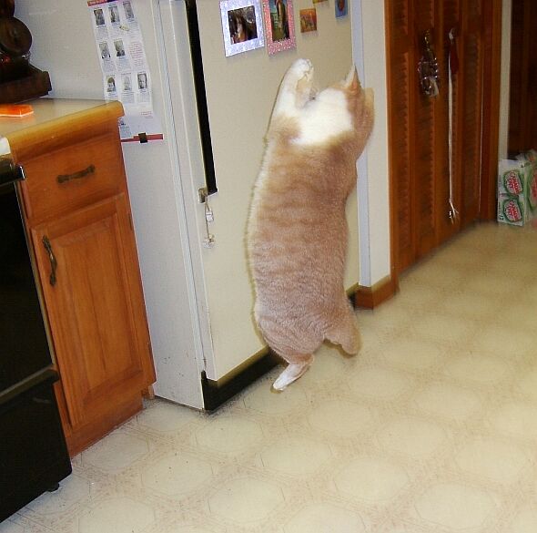 How do you like his Kung Fu kick in the first one? And I swear, the second one wasn't touched up or edited. But look how huge he looks against the fridge He's got that bread tie in between his paws.