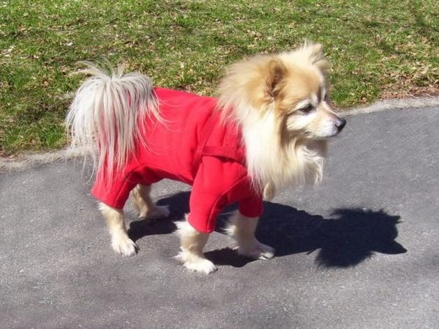 She is very comfortable in it. The long legged snowsuits have the legs a little longer and I fastened baloons on the paw area to keep it dry. It was a fun project and Cokette was protected from the wet salt.