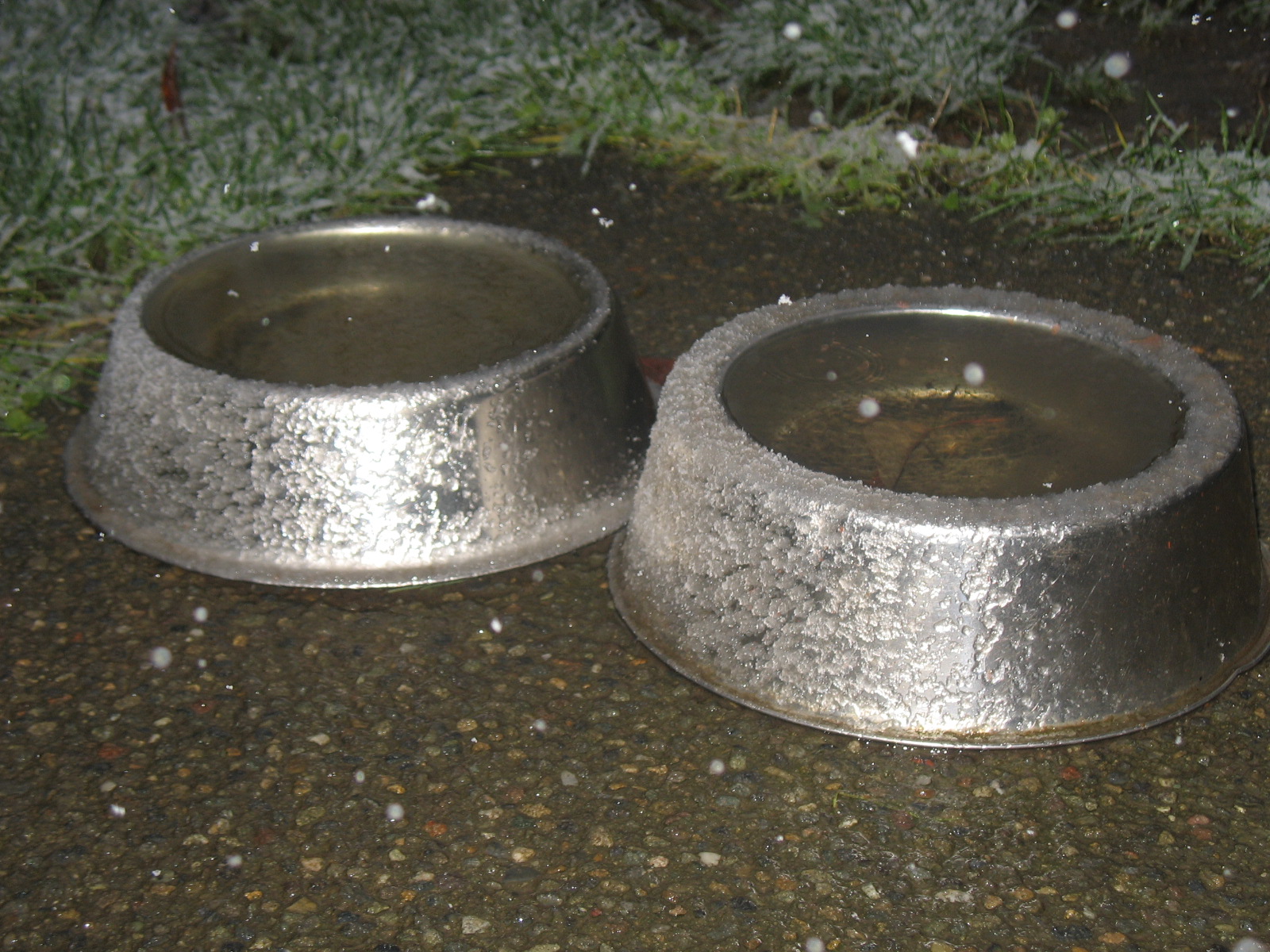 It is snowing here! The pictures below are Sandys water bowls and her frisbee.