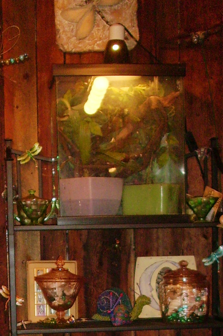 He's in there, he's just the same color as his plants. I'll try to get a pic of him by himself someday. He's actually a very cute, harmless little guy. He has no teeth, and he likes to wrap around your arm and get warm. He's pretty sweet.