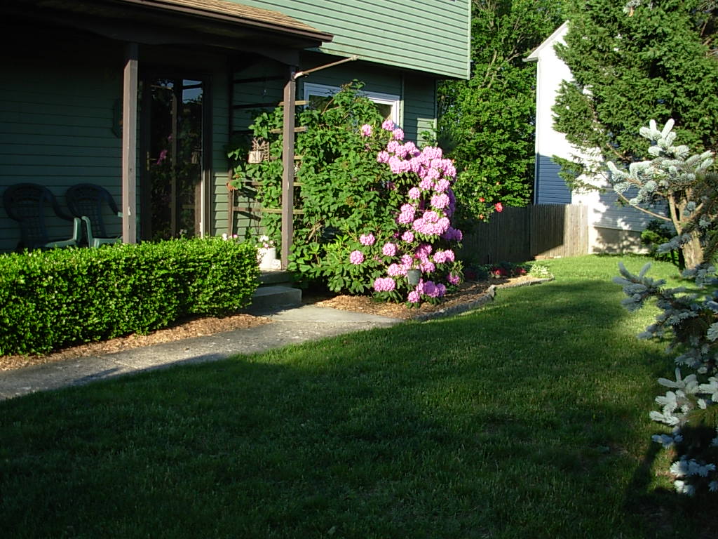 Here is my house from a year or so ago. They are not current but I chose them because there was some blooming going on.