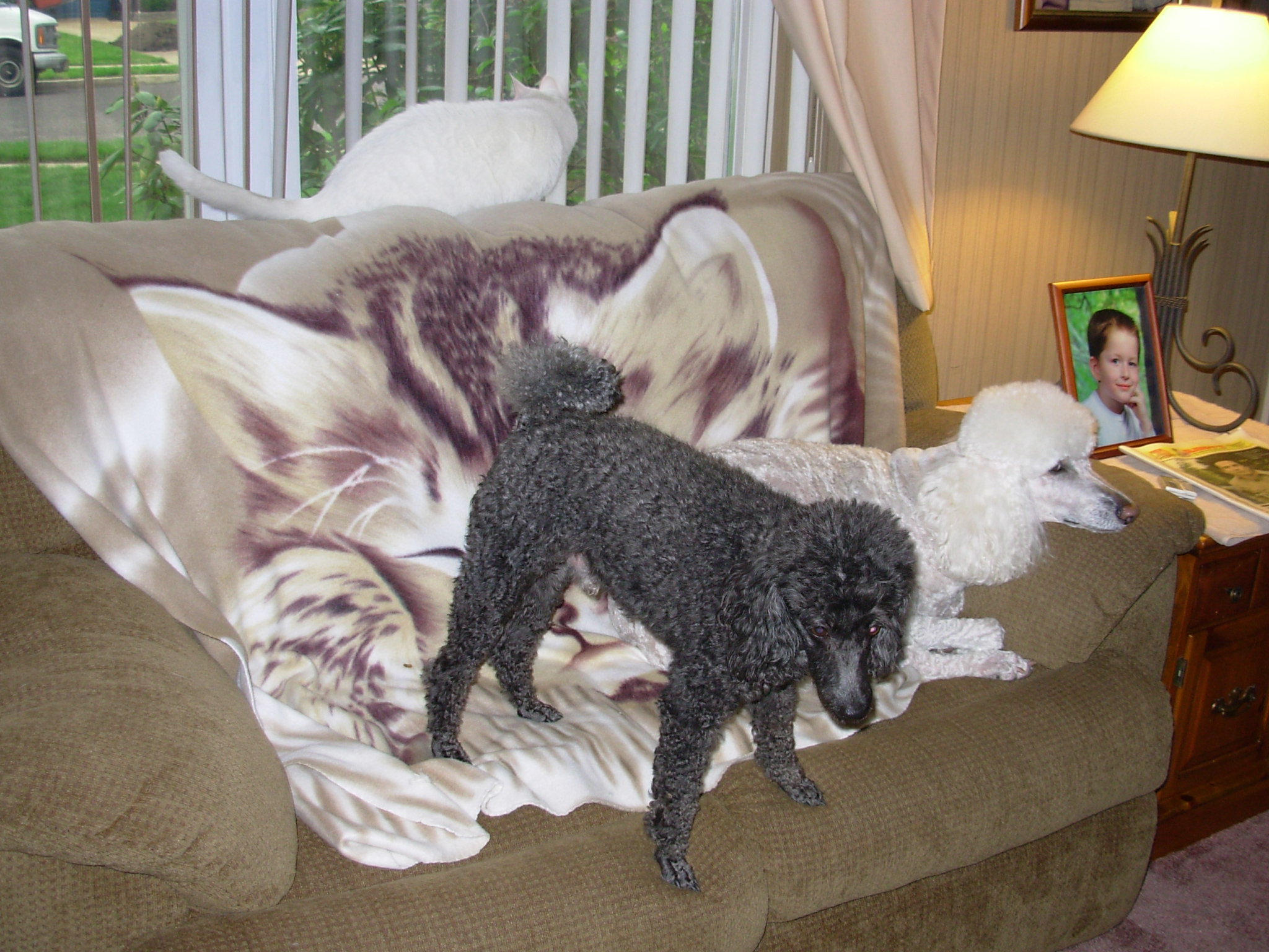 Well the fur is overflowing out of the nest as you will see in the picture below. Yesterday I groomed Bella and for a crazy minute though of leaving all of her fur on the ground underneath the nest. Then I thought if it got windy the neighbors might not like white poodle fur all stuck in their bushes.![]()