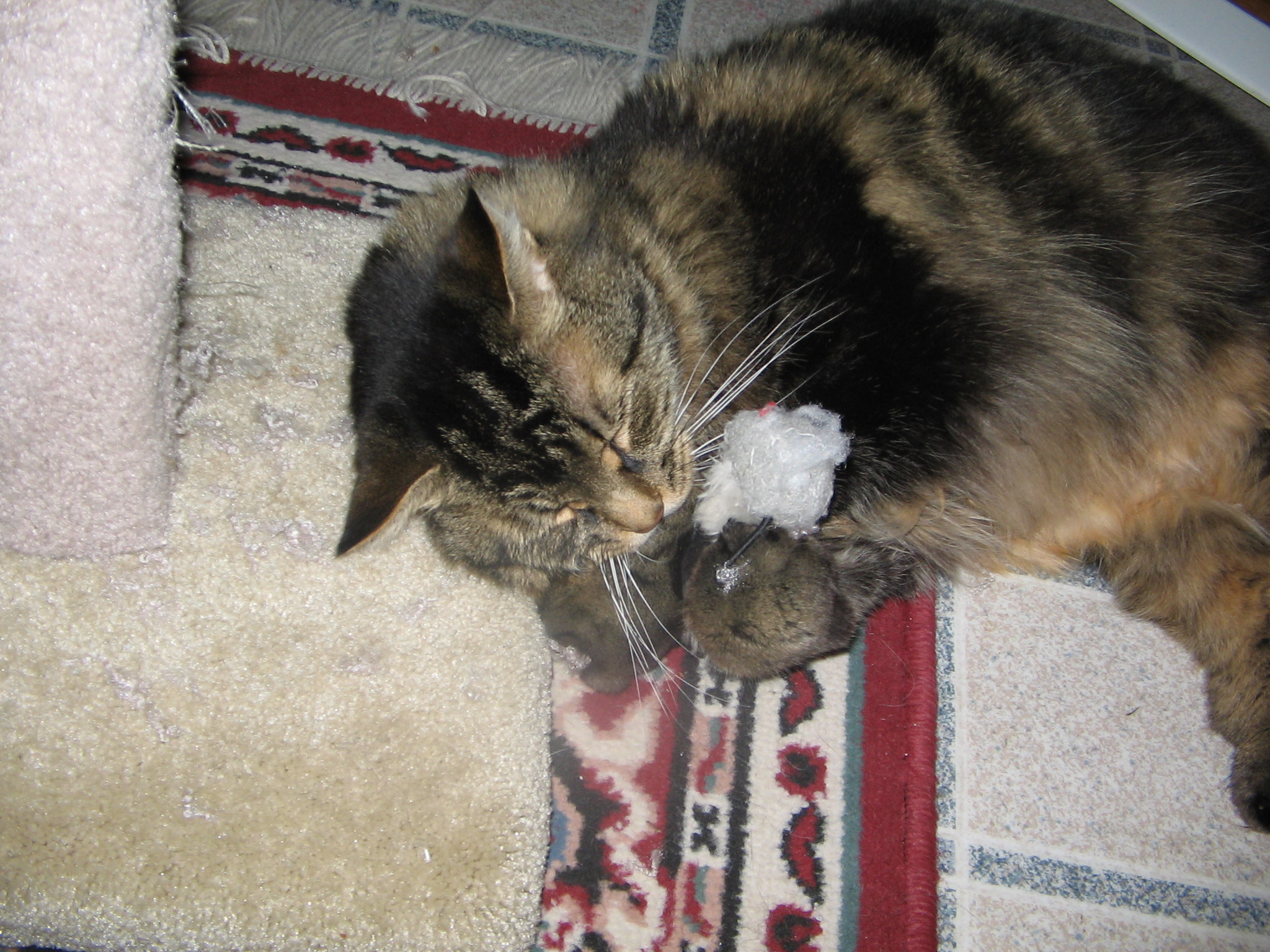 Day two and Tiger is doing great. This morning I heard some noise and went to investigate and found Tiger not only playing with his caterpiller stuffie but pummeling it and rabbit kicking it, a sign of true happiness!