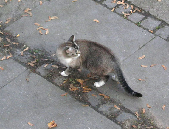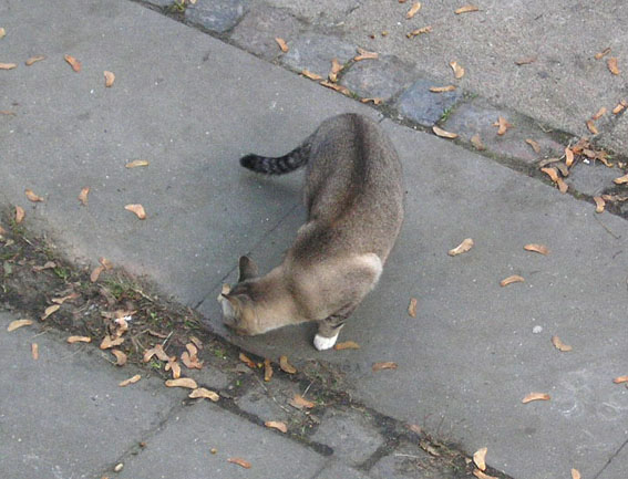 It seems that the strays around here know where to go for food. New ones keep showing up. Recently a young white one with black patches showed up, and now, another one came yesterday. The white one was taken in by a girl living in our building, just a few days ago. She has lived with cats all her life according to one of the other tenants, so should be in good hands.