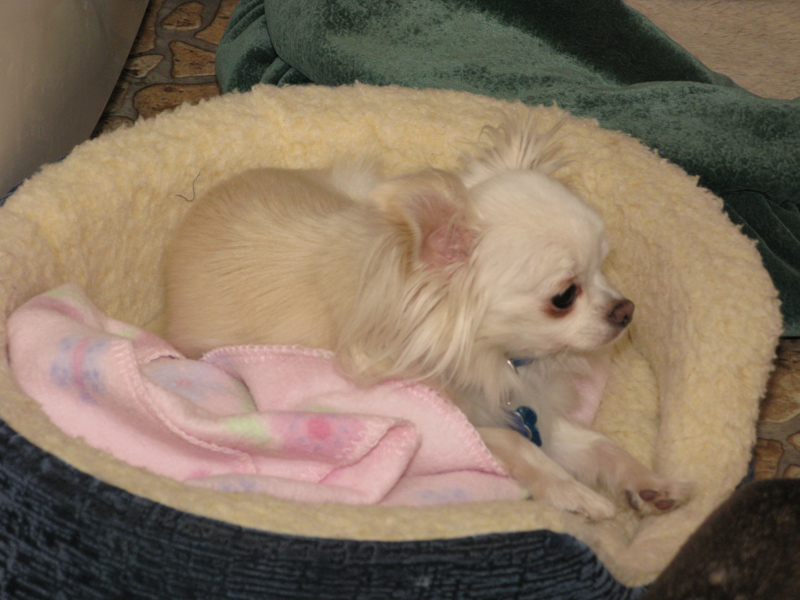 This is Rosy, the youngest of the chis at 4 1/2 years old. We adopted her in February 2004. We started out being her foster family. My dad and I drove in a snowstorm to pick her up from another volunteer with the rescue we adopted her from on Feb. 5, 2004. Two days later Rosy joined our family. She is a little social butterfly. The older chis like to pick on her tho.