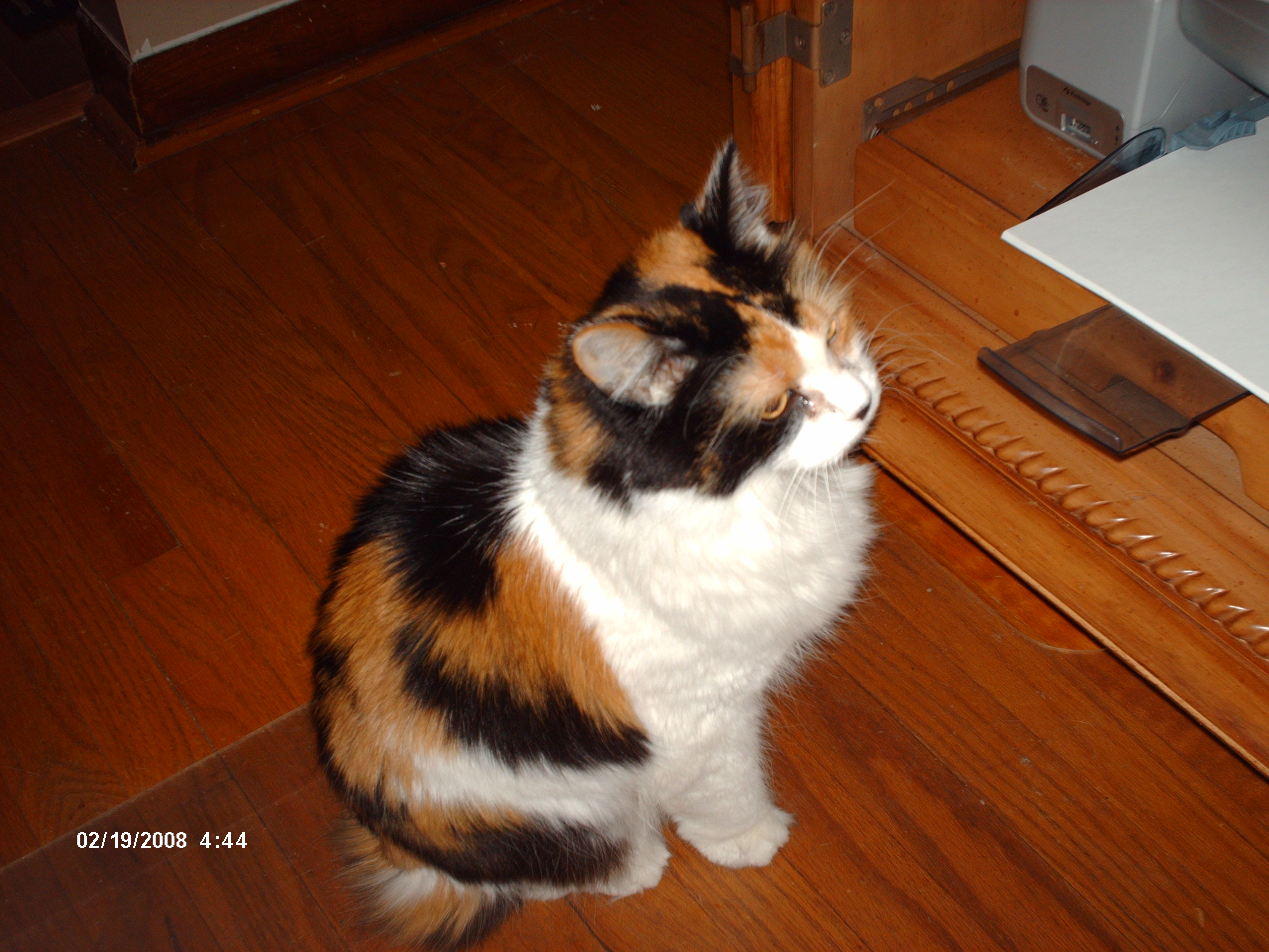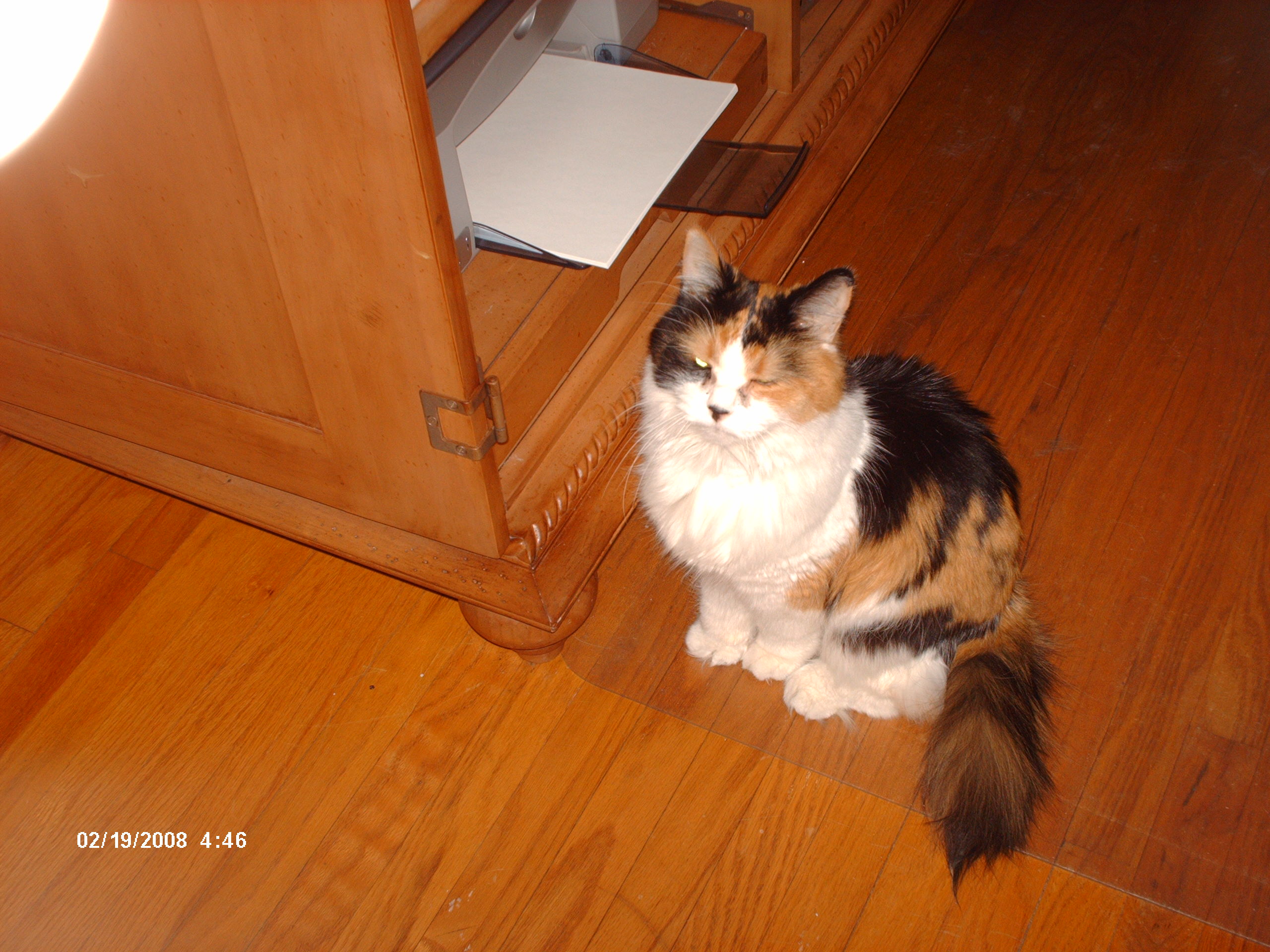 Name:	Puddy waiting for her spot behind the computer.JPG