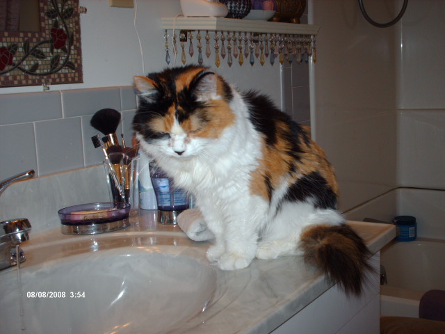 Ok, you all know the trials and tribulations that my Puddy girl has had so I won't go into that but this drinking out of the faucet has me stumped. If it was just a little quirk, I could deal w/it but she absolutely refuses to drink out of her fountain or water dish. She'll wait for hours until I come home, then is frantic to drink out of the faucet. I bought a drip bottle for gerbils yesterday and attached it to her carrier thinking that she might like it. I tried to teach her how to drink out of it, which she should be able to do w/no problem, because she likes to lick the faucet but either she doesn't understand what I'm trying to teach her or she's being stubborn because she won't go near it and turns her head away when I try to teach her. She's keeping me up most of the night because she can't reach the faucet on her own, can't jump up on a small step ladder any more because she's too weak. Any suggestions? Have you had this experience w/any of your CRF cats?