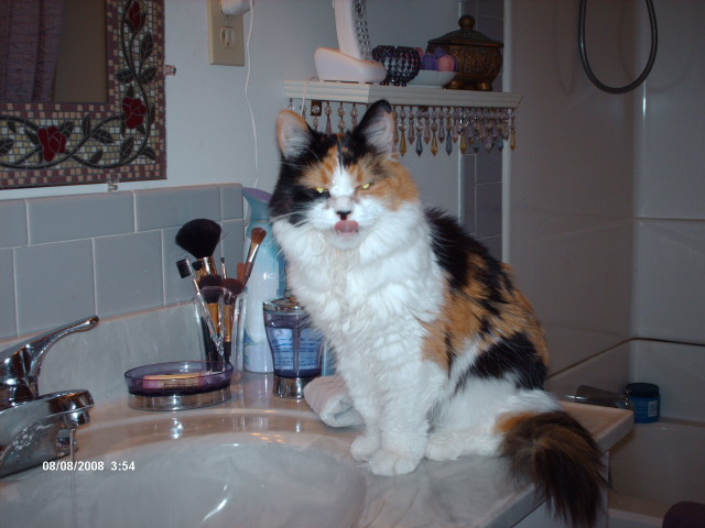 HA! I never would've put up w/this stuff w/my son. LOL Actually, I think that sometimes it's easier raising a child than a calico. She'll sit at the bottom of the staircase and meow incessantly until I get up. As soon as I walk into the bathroom, she scampers up the stairs to the faucet. She must be feeling a little better, though, because around 4:00 AM, she got into bed w/me and pushed her head into my hand, indicating that she wanted a noggin noogie. She hasn't wanted to even be touched lately; she's been such a hermit. I decided this morning that I'm not putting her back into her room. I want to see if she'll go out onto the patio and get some sun, which she usually loves but instead she ran downstairs into the basement and into one of the carriers. Guess she's just not feeling up to it yet. I gave her the second injection of Epogen yesterday and I'm sure hoping that it's going to do the trick.