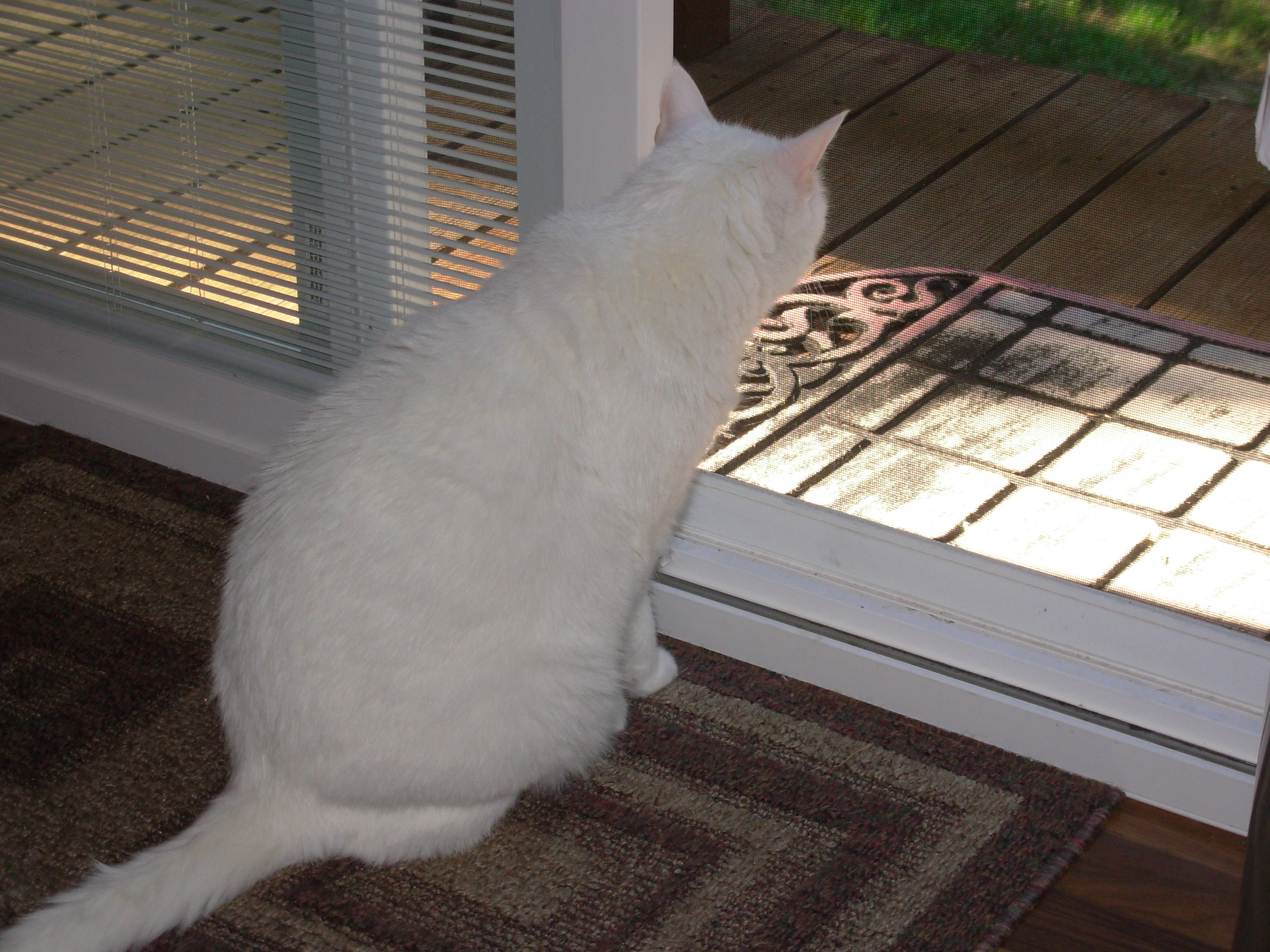 It has been so hot lately that the a/c has been running non-stop. Don't even ask about the electric bill. Today it is gorgeous - a preview of fall. Well, not exactly that cool but there is a wonderful breeze and the a/c is finally off and we are going to be in the high 70's for a few days. YAY!. Andy couldn't get to the screen door fast enough. He is one happy boy to be able to smell all of the smells coming in from the outside. Aaaah! Fresh Air!