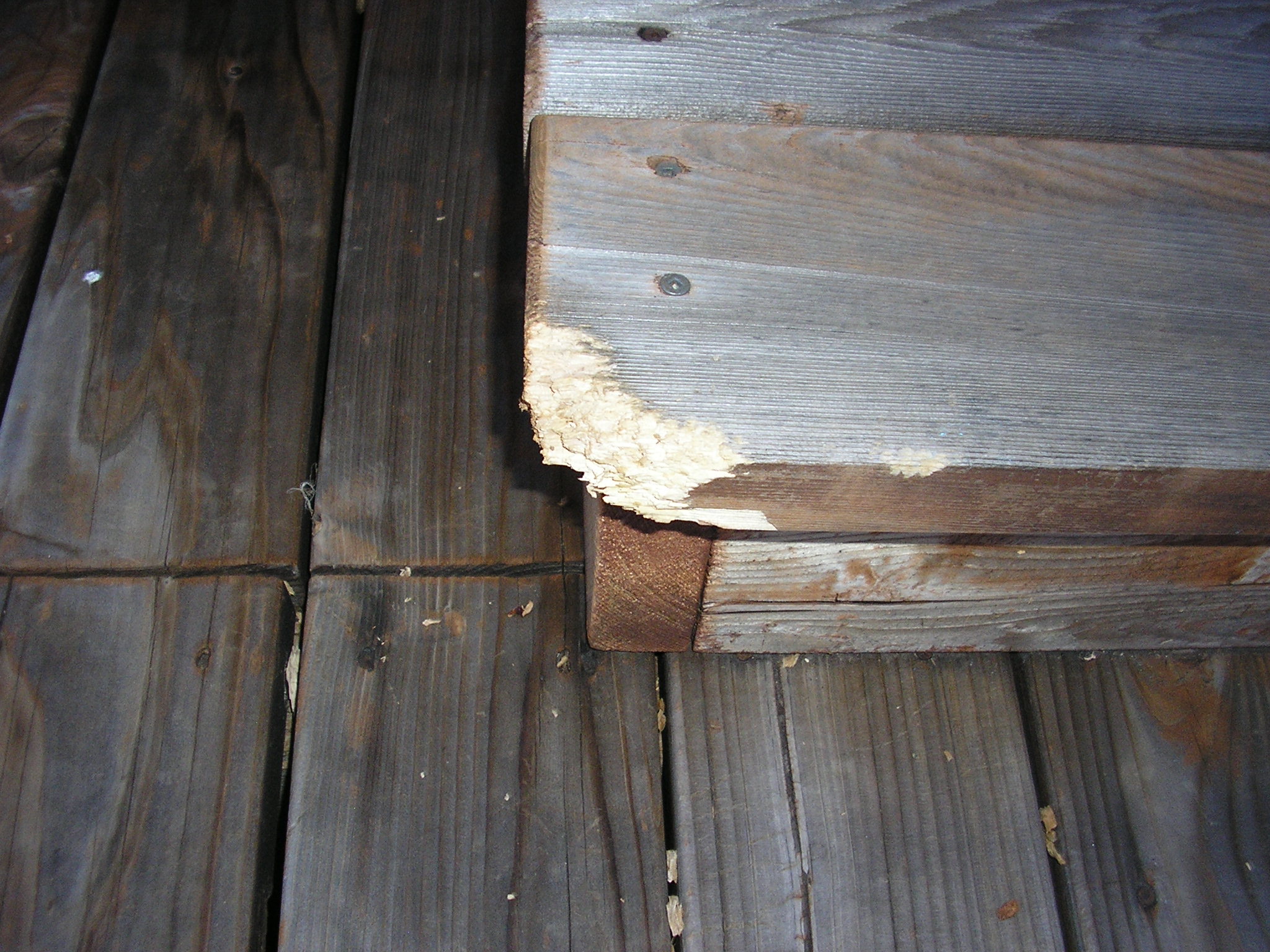 ) and even his poop looked like wood. He is chewing on the step, one of the posts of the fence and another step to the hot tub.