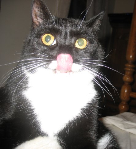 A couple of pics of Tinker tonight. She was on my bed while I was watching late night TV. I was just snapping random pics while she groomed herself and rolled around being silly. Love the first one of her, I snapped the pic as she was sticking her tongue out. Second one just a close-up of her face. I love her white whiskers against her black face.