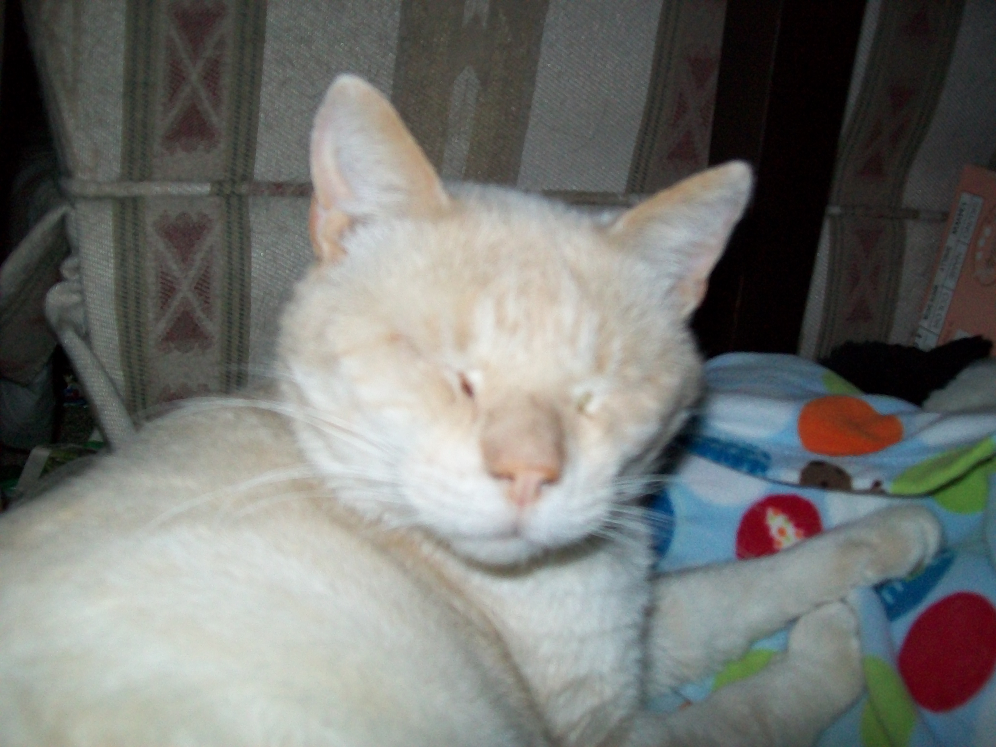 Ziggy came out last night for a little while, I kinda coxed him out with some lunch meat. Poor guy I just feel terrible. I was looking back at a few pictures and when we first got him back in April he had a round mid-section then too and he was pretty thin but then by June he looked so much better and last month he had his eye surgery and the vet didn't say anything about his mid-section or anything and he looked good but then this month he's not looking good at all.