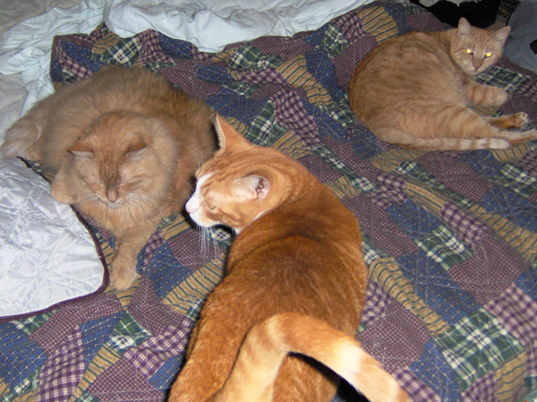 My fiancee and I are newly relo'ed to lovely Georgia, but this time of year, even here, it gets cool at night..... and we are stuck for a while with ONE TWIN bed in the house.... and on a cool night, that twin has to be (ahem!!) "SHARED" with 4-5 of these creatures, AND a 60-lb. 10-year-old golden retriever......