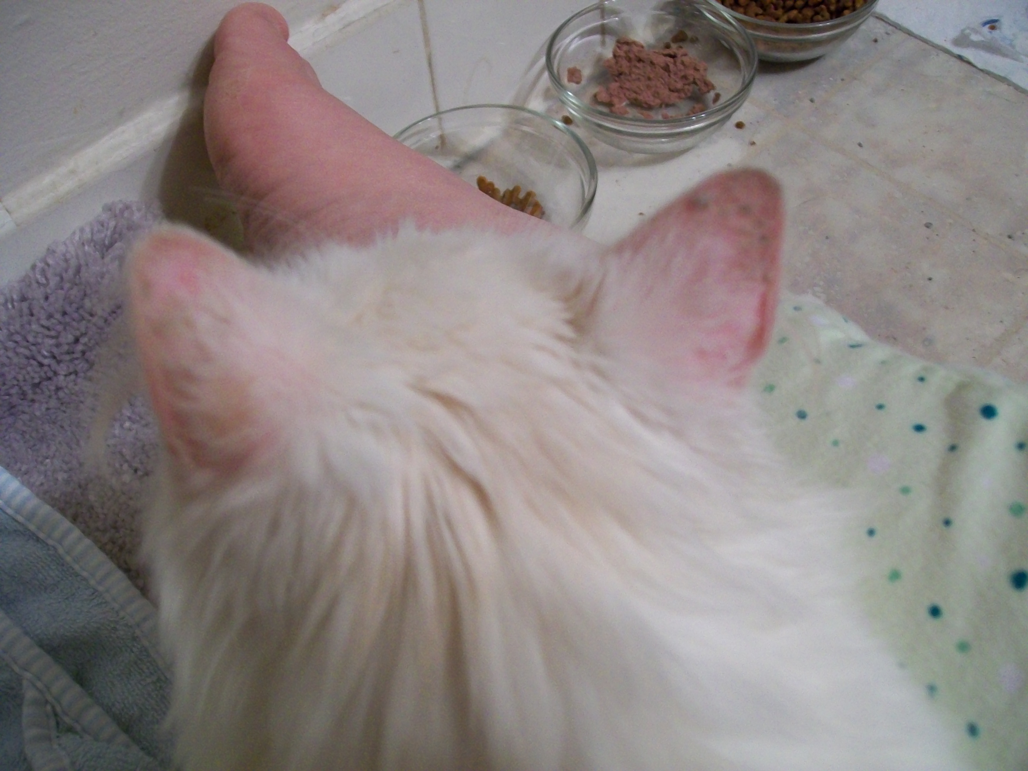 She is such a little beauty!! Thank goodness she has an angel looking out for her and the other homeless kitties. I rescued a big, beautiful white longhaired cat from a local dollar store last year. His ears were crusted with blood on the tips. The vet said that it was skin cancer, that white cats should never be outside cats because of their sensitivity to the sun. My rescue went to live with a Doctor and am told is doing just fine. Diana/Isis' ears don't look anything like my rescue's did, just wanted you to know about white cat's delicate skin.