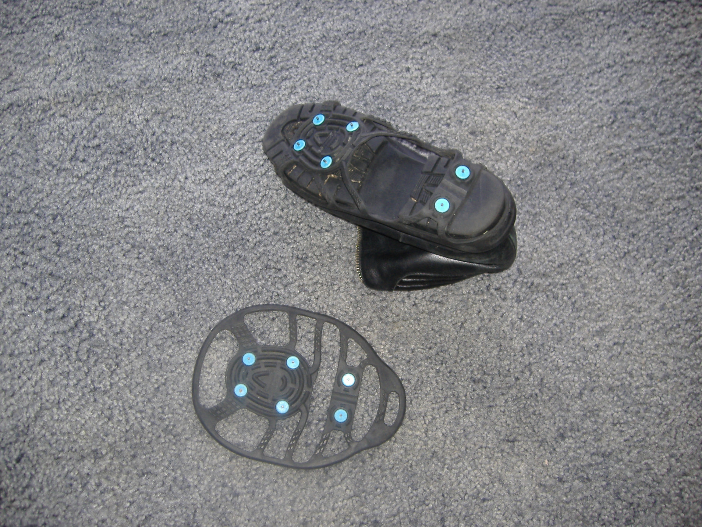 What I have is called "Get A Grip", and they are stretchable rubber with a few metal cleats embedded in the bottom (in the center of the blue areas pictured) You just pull them on over the toe and heel of your shoes or boots. They came in a nylon pouch, so lots of times I just toss them in my purse when I go out, if I will be going shopping and don't know the condition of the parking lots at the stores.