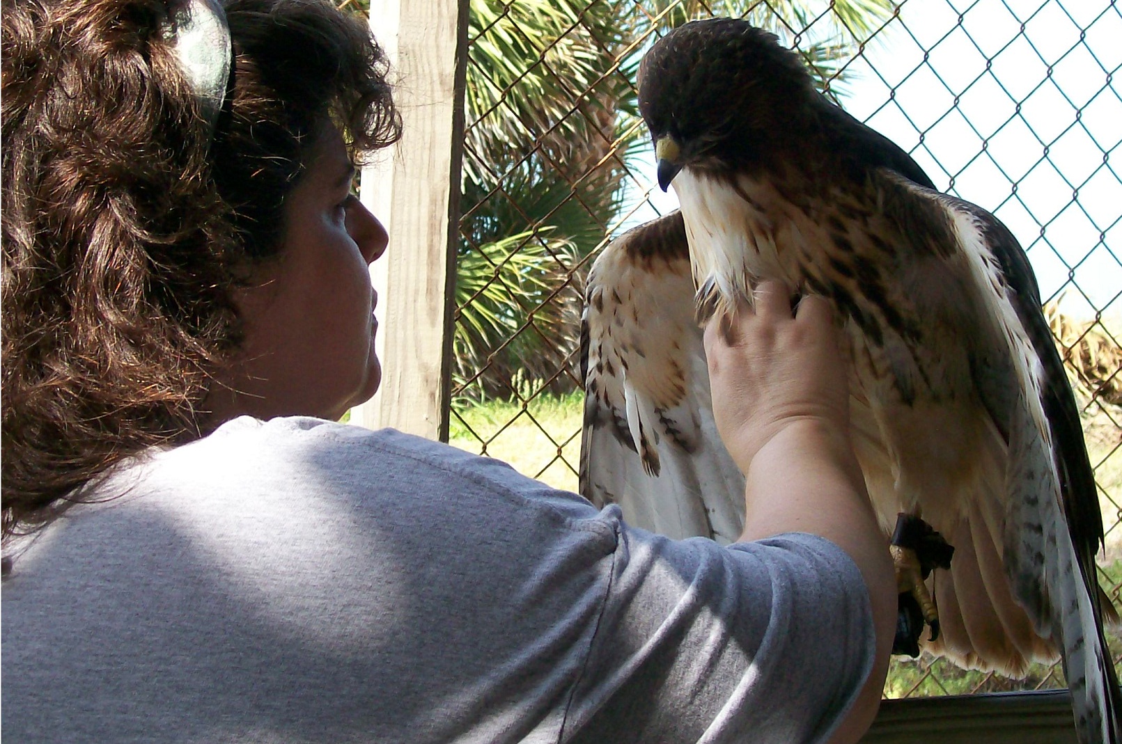 I visited my hawk friend Isis this weekend and my friend Mary Ann took some pictures of us. Here are two of the best. I can’t tell you how fabulous and soft she is. . .can you imagine that I can do scratchies with a hawk? ! ? I love her more than I can say.