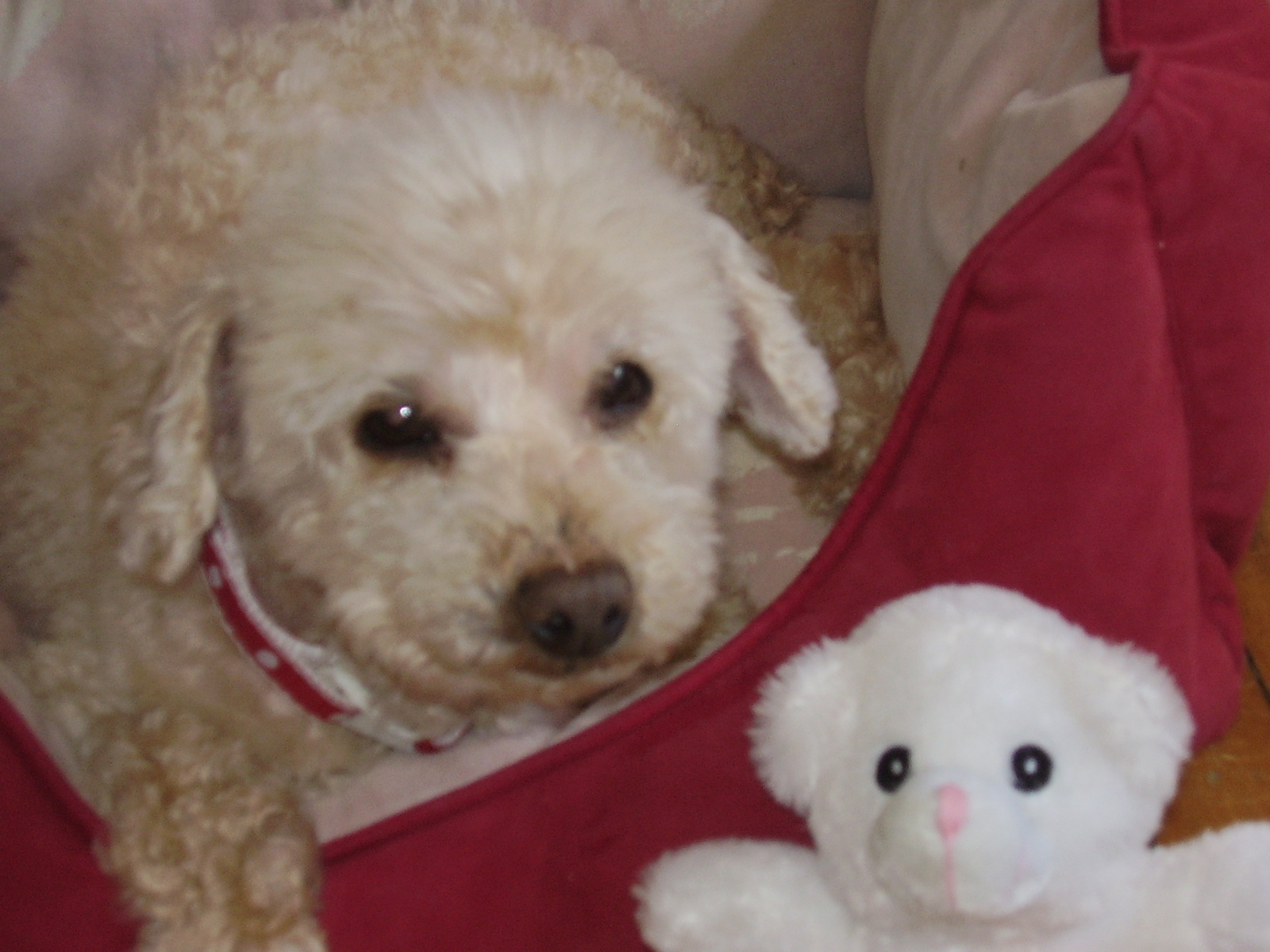Thanks everyone ! Both Finny and Ben are doing well and enjoying each other's company! I may be getting Precious (the 14 yr old miniature poodle) back again in a few days as well. We had her for a couple of weeks and then the rescue thought they had found her a home; sad to say it did not work out as she is rather incontinent and may be diabetic. We are happy to have her as she is lovely and snuggly and quite a character so she would be welcome to stay as long as she needs ( as will Finny!) which may be the rest of her life. She was abandoned in the middle of the Montreal winter and found hiding under a truck poor baby! This a picture of her a couple of weeks ago!