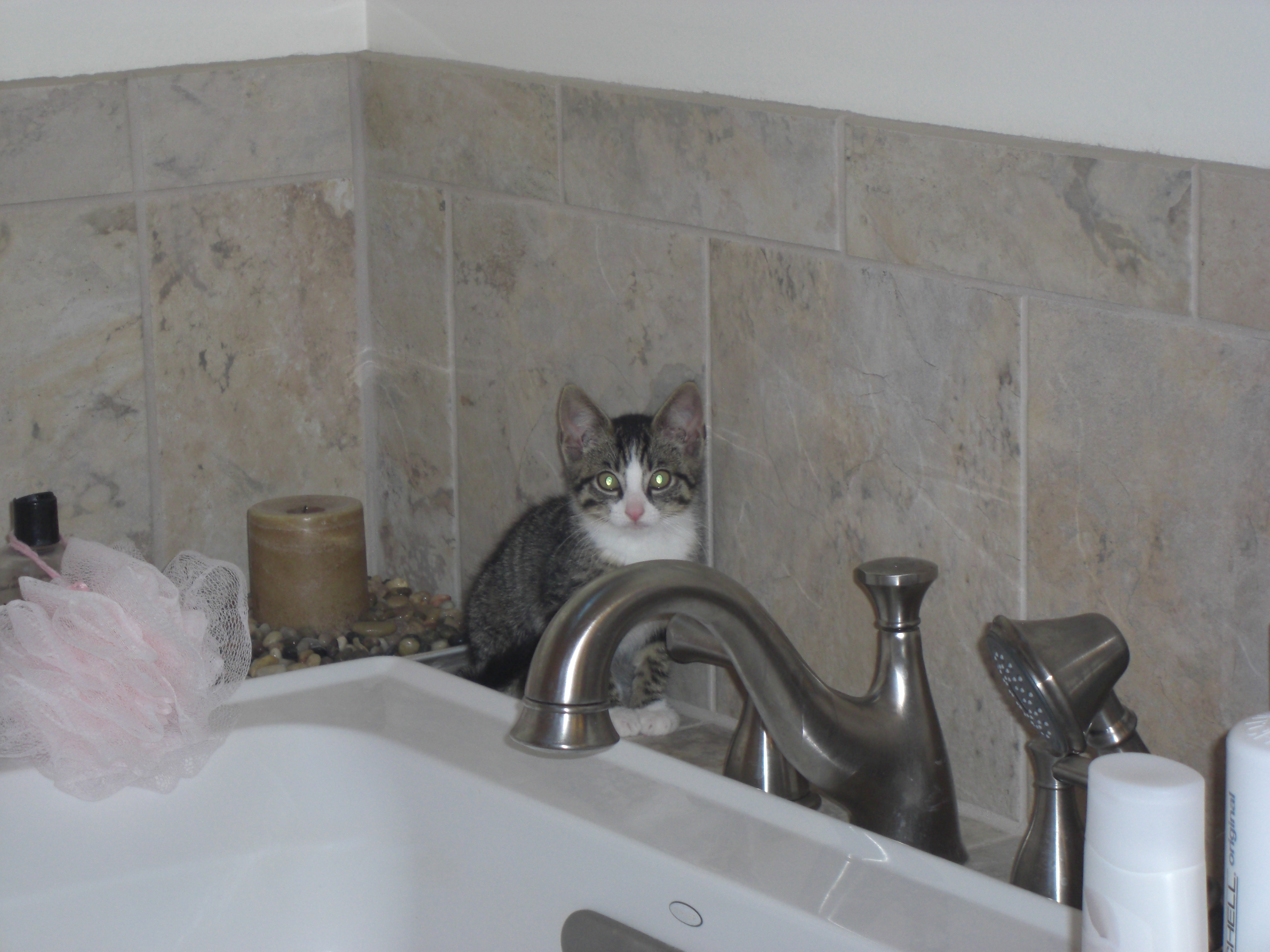 He is 100% comfortable with Sunny (dog) and she is able to take a treat off the floor 6 inches from him and he doesn't flinch. She is actually still a little scared of him. He lights up when he sees my 14 year old cat who looks like he could be his father. Unfortunately, Moon wants nothing to do with him but it's so obvious he misses his mommy. We have heard of 2 other kittens found near where we found him so we are assuming someone either dumped the litter or their mom was killed. The vet says he is 8 weeks old which means he was 5 weeks when we found him and should still be nursingbut he definitely can eat on his own too which is good.