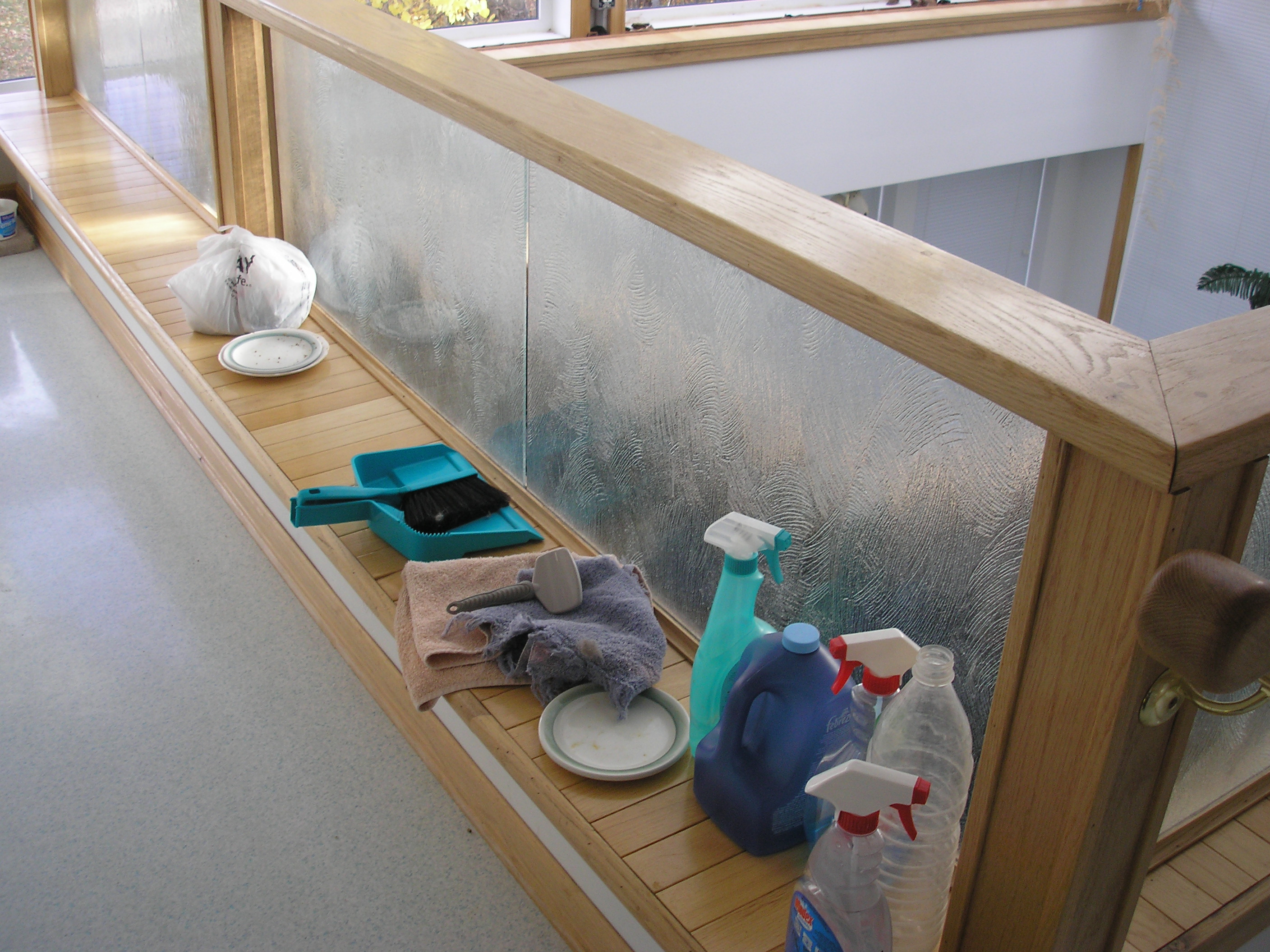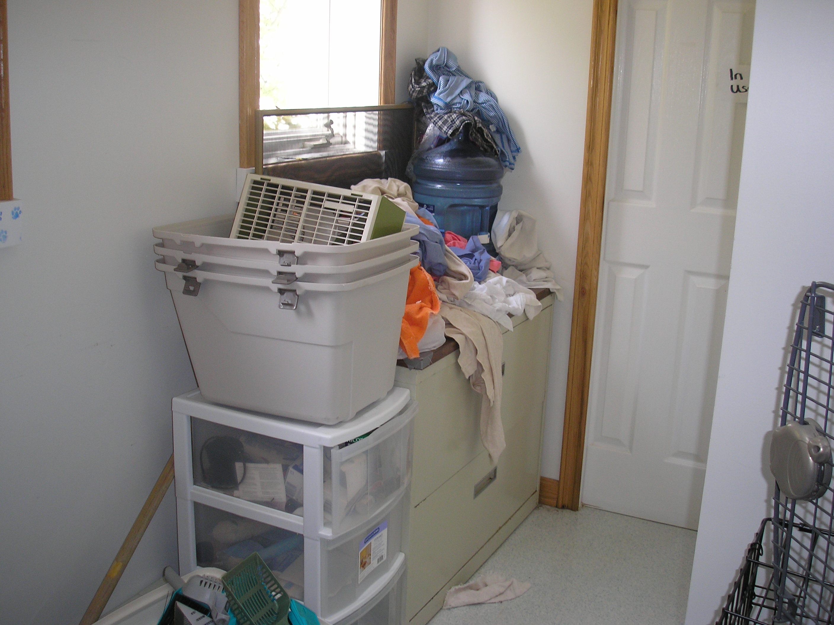 NB - the dishes are as they were on Tuesday; also, the used room broom upstairs on the ledge has been there since Tuesday; none of the litter boxes or scoops have been cleaned. I was stunned to find out that the place has run out of the sanitizer in which clean brooms, scoops and boxes were soaked for 15 minutes - and none has been ordered to replace it.