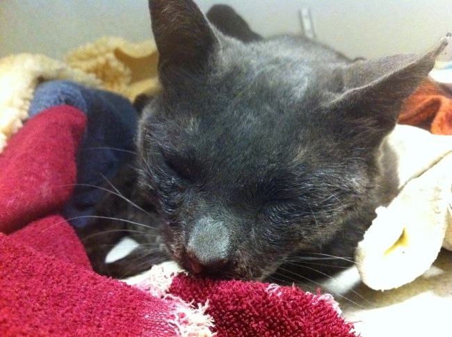 Everyone following Carmichael's progress and sharing his story on Facebook and Twitter has been amazingly generous, so I don't want to ask anyone who has donated to give more. However, if it is possible for everyone to keep sharing, perhaps it is possible to get a bit more funding from other donors. Carmichael is not only tame, but a very sweet, good-natured cat. He has had to deal with a number of people poking around his poor tender mouth, cleaning his nose, putting ointment in his eyes, etc., and he always cooperates, even purring when gets his treatments.