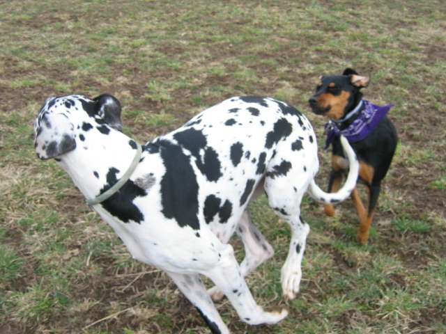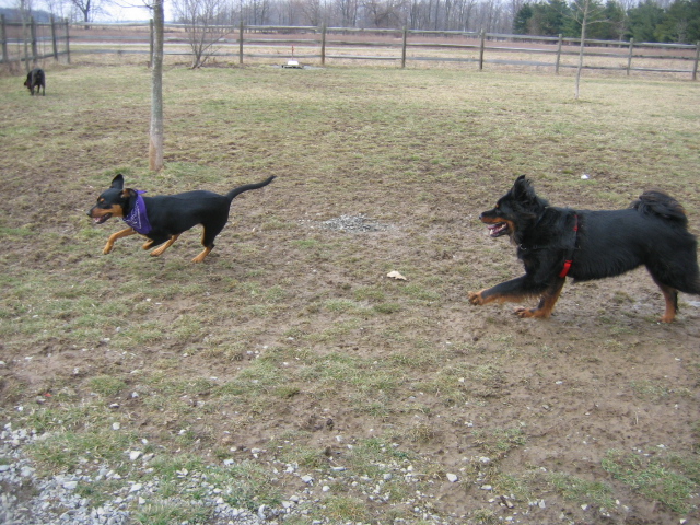 Kiara, probably the most submissive dog there, chasing basically the biggest dog there. I still think Dakota should come home with me