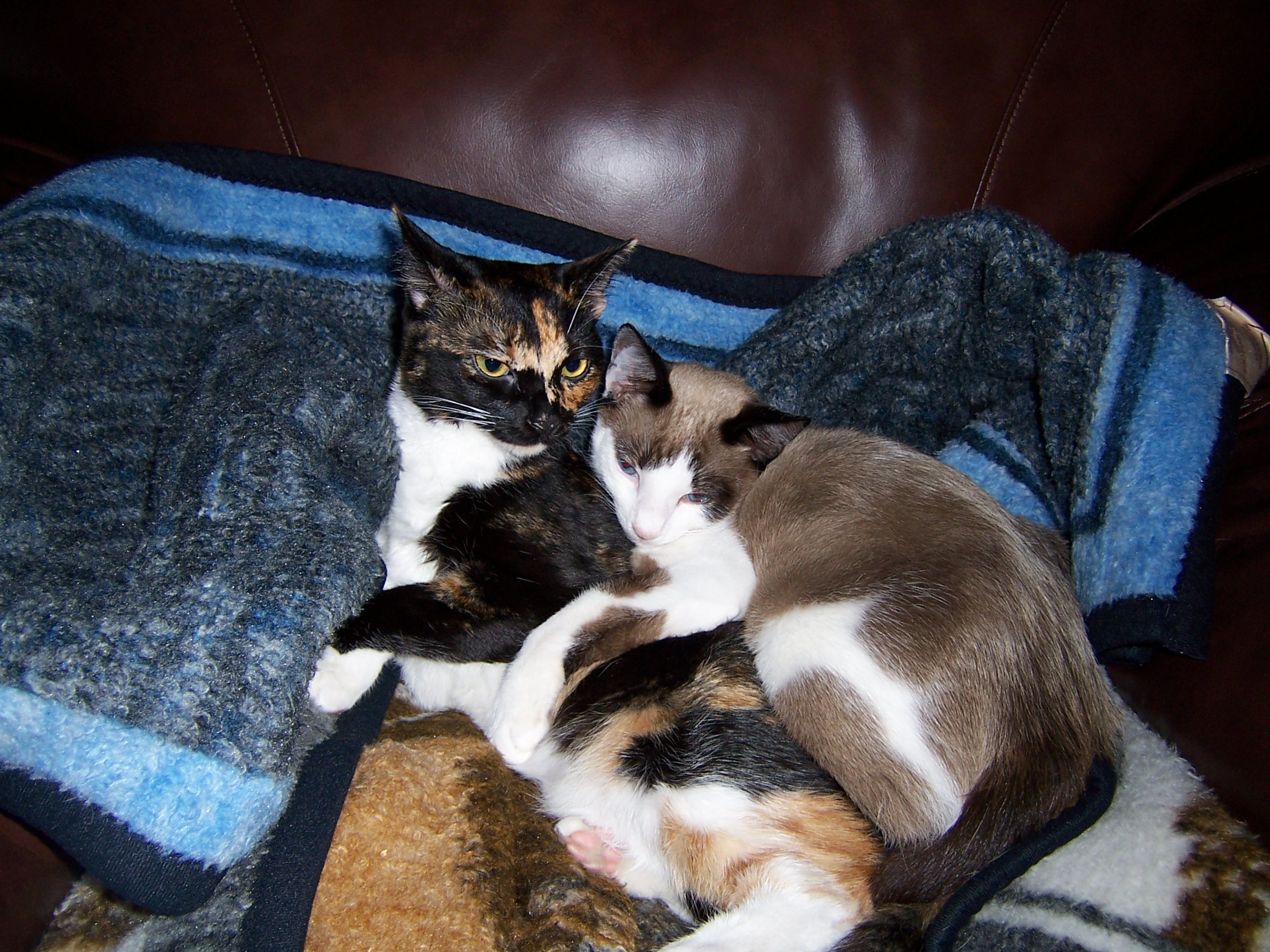 I used to own a tortie...her name was Nitschke and she was my baby girl. I recently had to give her away because my parents said four cats was too much (I'm sure some of you remember my post about this). Luckily, she went to a good home, with her closest kitty friend, Jake, who is just a bit younger than her. (She is about a year old and he is just a few months under a year right now.) Anyways, she had a lot of "tortie-tude": her meows were so full of attitude and were pronounced often. (I liked this a lot, it gave me a lot of laughs!) When she wanted her food-she would nip me in the early morning hours so as to get her point across. Yet, she was a loving girl, always around people, offering them her soft, velvety, colorful fur to pet-a wonderful addition to the household. She will forever be missed, along with her brother Jake-he will be missed, too. But I am glad that they went to a good and loving home where they in turn will be cherished. They are doing fabulous, by the way. I often get replies from their owner telling me and my family how they are doing. They've been happy and healthy, and Jake has been gaining weight. (He is still growing, but hopefully he doesn't get overweight!) Well, just thought I'd share my input on "torties". They are really awesome kitties. I am attaching a picture of Nitschke and Jake, who will be furrever missed and remembered.....