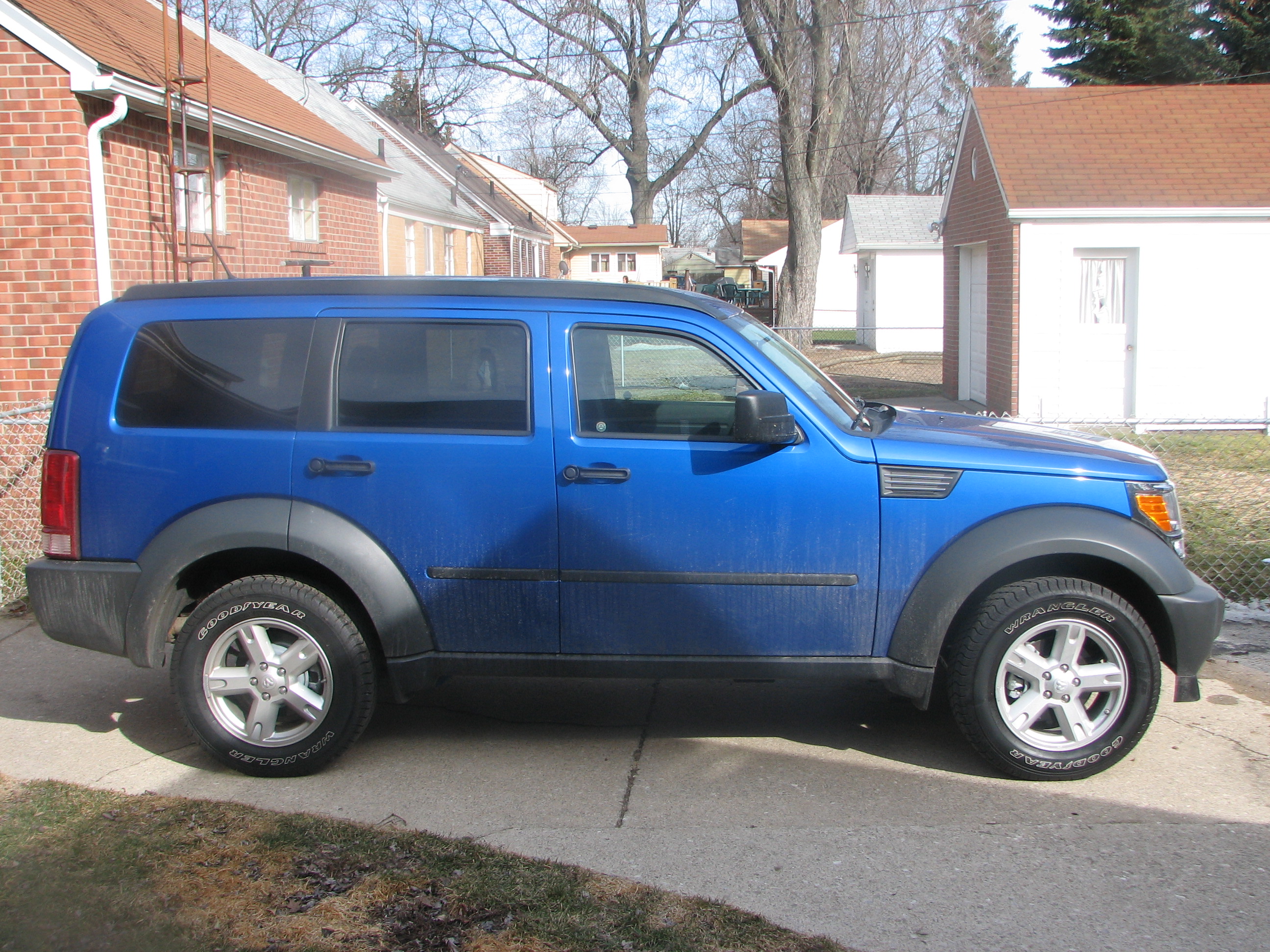 Since a few others are sharing their new cars, I thought I show off mine! My lease on my 2004 Dodge Dakota was up this summer, and I wasn't sure what I wanted next, so I decided to start looking early....and ended up trading in early! For the next 27 months, I will be driving an Electric Blue Dodge Nitro. I got it last Monday night, and love it already!! It is a little dirty, since it snowed this week, but here it is!!