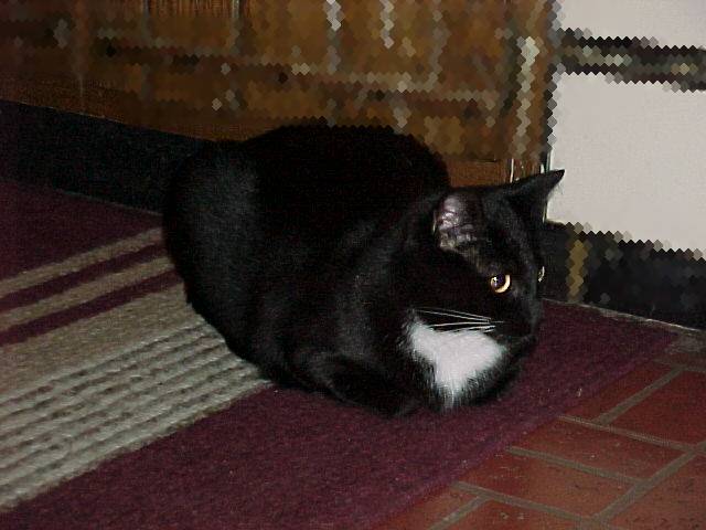 Here's an old picture. My mom thought she would make it easy on Tubby and leave the cupboard door open. Notice the mousetrap too....she wasn't taking any chances.![]()
