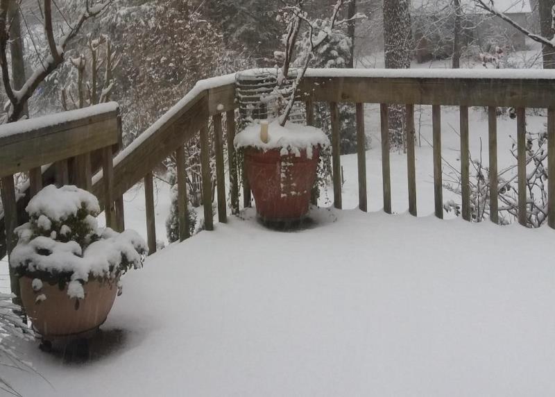 North Carolina is having an unusually cold and snowy winter. This morning, it started snowing at 4:30am (I know because that's kitty breakfast time), it's 9:45am now, and we have already 4 inches. Windchills tonight will be in the single digits and below zero (in F).