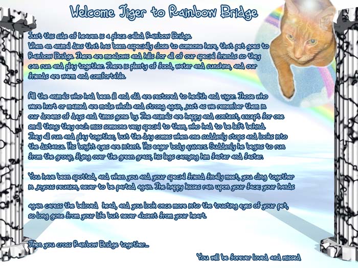 I am glad you like it Kelly. Now no matter what you will be able to look at Tiger's memorial and know he is happy and ok and waiting for you at the bridge.