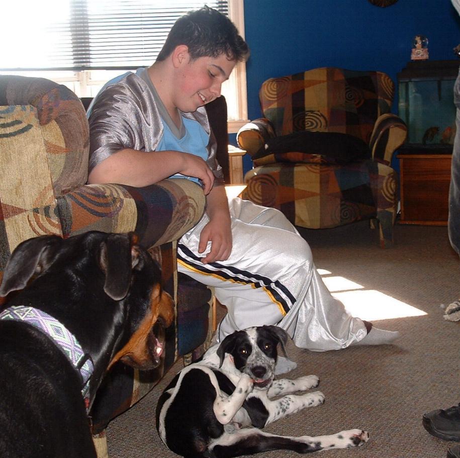 He is a cutie, Dane? Dog food by the case, its nice Lucy is playing back. Did someone have him before? If he is sitting and likes his crate he'll be potty trained in no time. Lots of luck with him. Where does his new name come from?