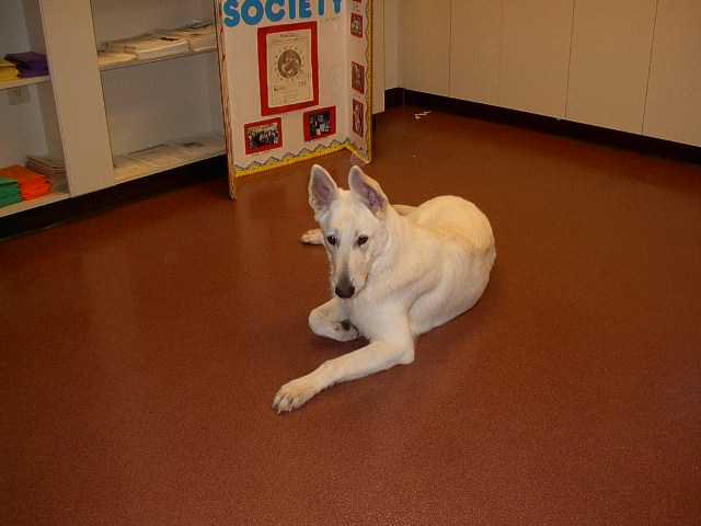I was at the shelter yesteraday exercising the bog dogs when I cam across Snow, a white GSD mix. Gorgoeus! I was looking for his paperwork and found none in the book. That meant he had been taken out of adoptions. This freaked me out, needless to say. I talked with the receptionist and she said that Snow was 8 months old and was about to get put to sleep coz he nips!